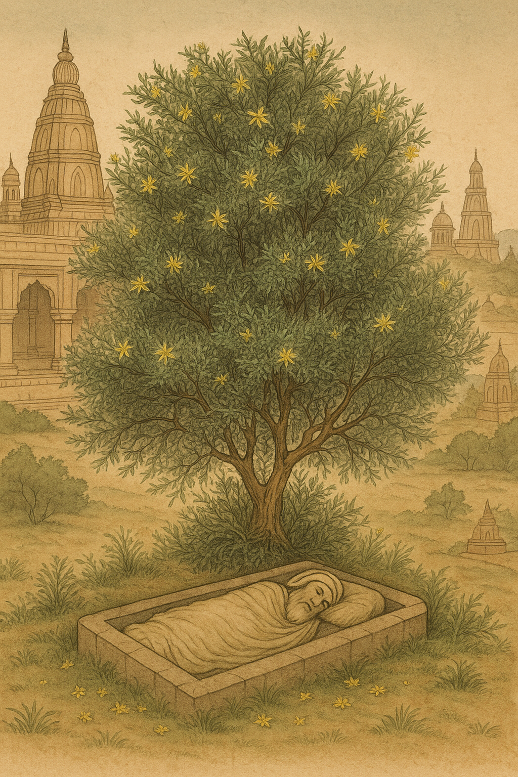 A 15th-century account set near a pilgrimage site (Pandharpur) tells of a taraแนญฤซ tree (today known as Capparis divaricata) sprouting from the grave of a saint โ€” a sun-loving shrub typical of open savanna habitats. (illustrative image)