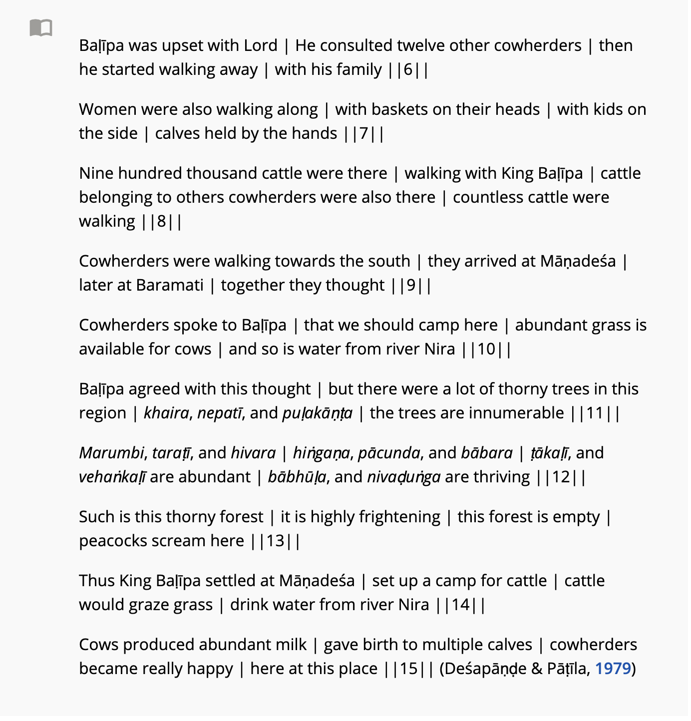 According to this narrative poem, Baแธทฤซpa Gavaแธทฤซ was the king of the cowherders and was upset with the Lord. He travelled through Mฤแน‡adeล›aโ€”a region roughly comprising parts of Pune, Sangli, Satara and Solapur districtsโ€”to eventually arrive at Baramati (Pune district). The fellow cowherders found the region near Baramati suitable for cattle grazing due to the abundance of grass and water from the Nira River catchment. While the region seemed suitable otherwise, Baแธทฤซpa noticed that it was full of thorny plants. Here, the poet describes the landscape and lists the plants in it. Qualitative analyses of descriptions in the excerpts point to a historic landscape that contains trees embedded within a grassy layerโ€”typical of savannas rather than forests.
