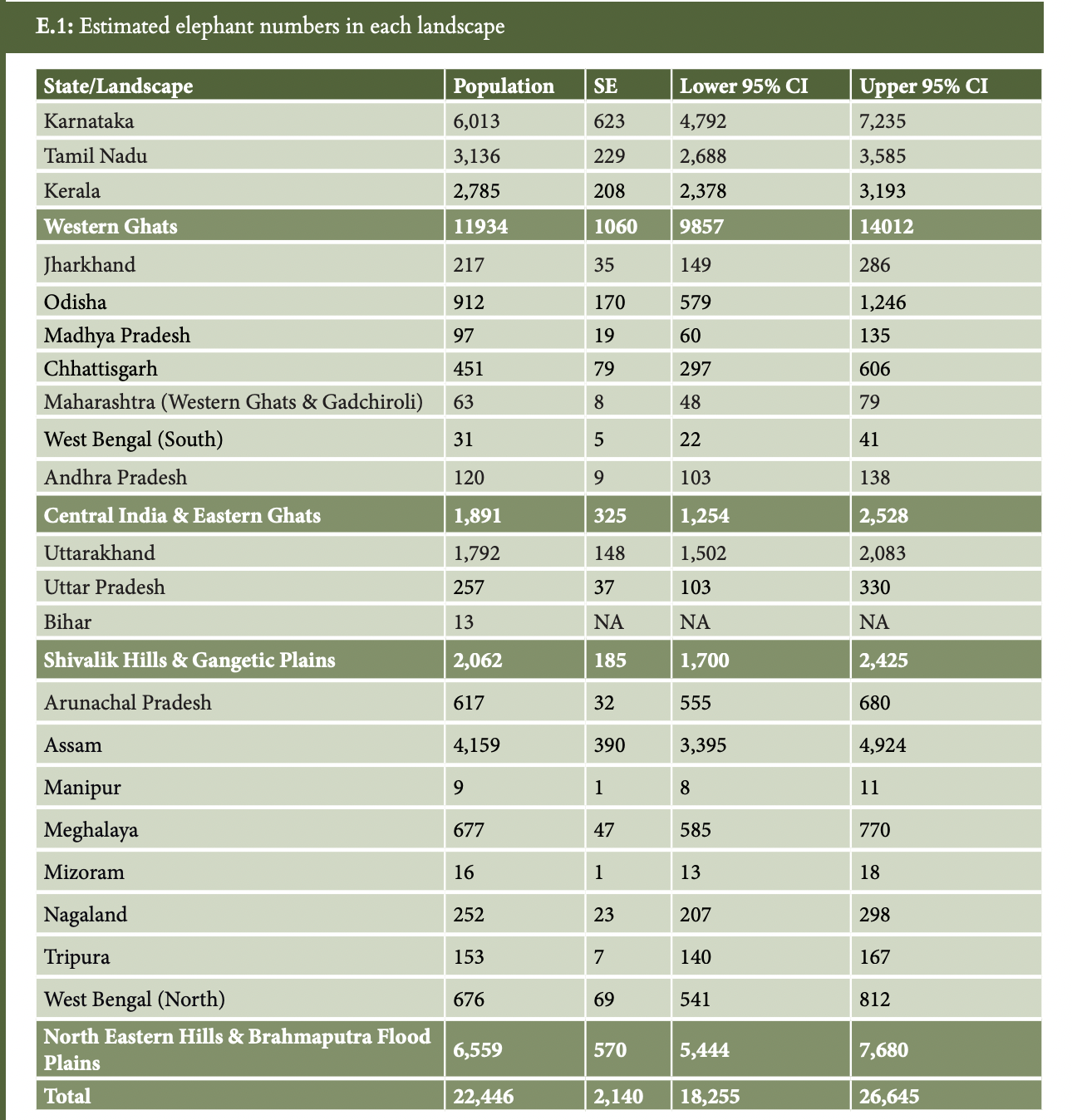 The report had the following findings of state wise and landscape wise elephant population in India, with Karnataka having the highest number of elephants,