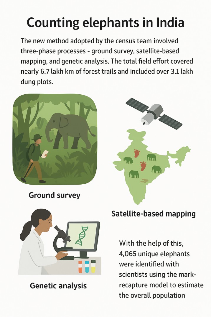 The new method adopted by the census team involved three-phase processes – ground survey, satellite-based mapping and genetic analysis. The total field effort covered nearly 6.7 lakh km of forest trails and included over 3.1 lakh dung plots.