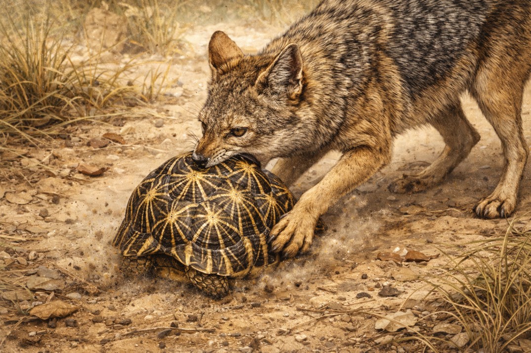 Every predator has a limit to how wide it can open its mouth—this is called the gape. To crack a shell, a jackal needs to get its upper and lower teeth around the widest part of the tortoise to gain leverage. Most tortoises have somewhat flattened shells, but the Indian Star Tortoise has an exceptionally high, “tented” dome. Because the sides of the shell are so steep and the surface is so smooth, a predator’s teeth simply cannot find a flat surface to bite down on. As the jackal tries to bite, its jaws slide off the steep, curved sides of the dome.