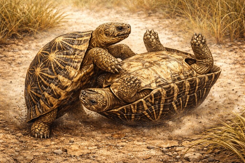 The “wrestle” can last for a long time, with both tortoises huffing and hissing (the sound of air being forced out of their lungs as they strain). If one male manages to flip the other onto his back, the battle is effectively over. The loser is now stuck in his “unstable” position. While his Gömböc-shaped shell will eventually help him roll back over, it takes time and immense effort. By the time the flipped male has righted himself, he is usually exhausted and disoriented. The victor has already claimed the territory and the attention of the female.