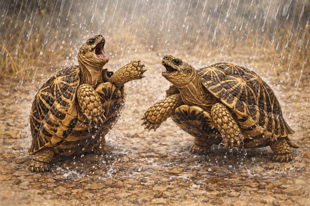 The monsoon dance is actually a biological necessity. After months of surviving the scorching heat, dust and grass litter gathers on the body of the tortoise. The rain washes away months of accumulated dust and parasites from their shells. More importantly, they drink deeply to flush out their systems and rehydrate their internal organs after the long drought.