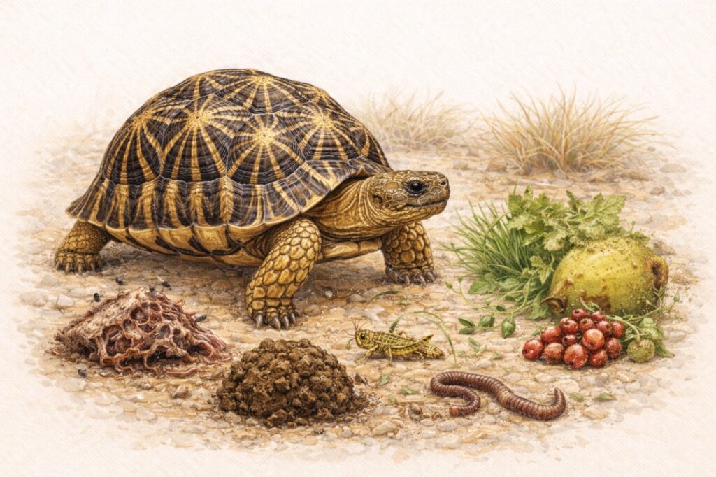 To survive in the arid scrublands of India and Sri Lanka, the Indian Star Tortoise has evolved to be the ultimate opportunist. Its diet is a fascinating example of how nature balances nutrition with a harsh, unpredictable environment.