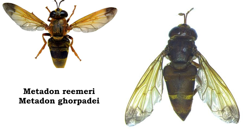 Researchers Hariharakrishnan Sankararaman (Amrita Vishwa Vidyapeetham) and Sainulabdeen Sulaikha Anooj (Kerala Agricultural University) recently discovered two rare ant-eating fly species in India belonging to the Microdontinae subfamily. Named Metadon ghorpadei and Metadon reemeri, the two species were found in the Delhi Ridge forest and the Siruvani hills of the Western Ghats in Tamil Nadu, respectively. They are notable for their mimicry of stinging wasps, and the slug-like larvae of both species infiltrate ant nests, where they feed on ant eggs and babies. Metadon ghorpadei possesses pale brown antennae, yellow legs and golden hair covering the body, whereas Metadon reemeri has blackish antennae as well as distinctively dark hind legs. The discovery of these species is of considerable significance because the Microdontinae subfamily is one that has barely been studied in India over the past century.[1]