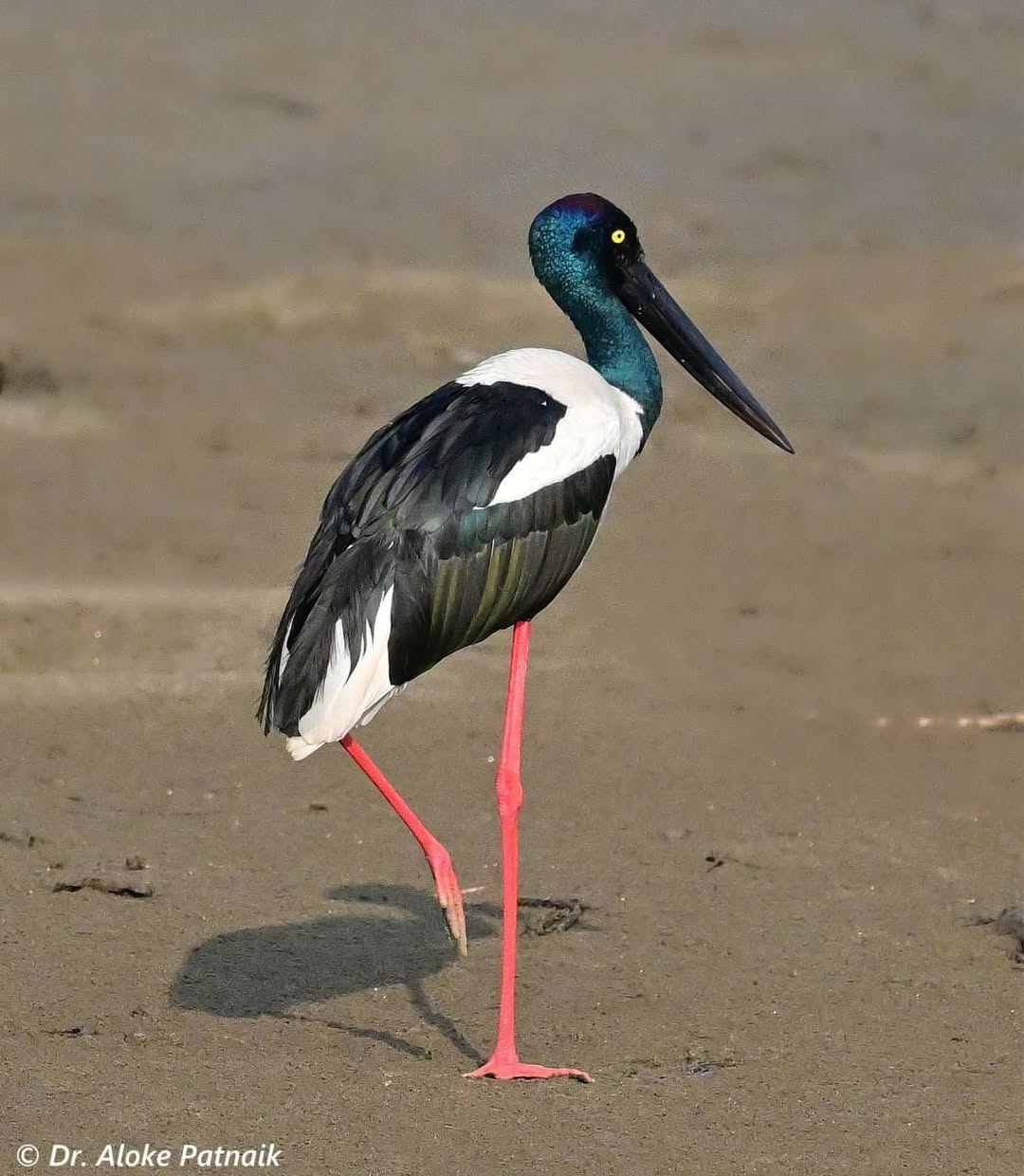 A black-necked stork stands alert on the sandy riverbed at Dikhala, its iridescent blue-green neck catching the light, long coral-pink legs stark against the muted earth tones of the floodplain. Among the tallest and rarest wetland birds in India, the species depends on undisturbed rivers, marshes and seasonal grasslands.